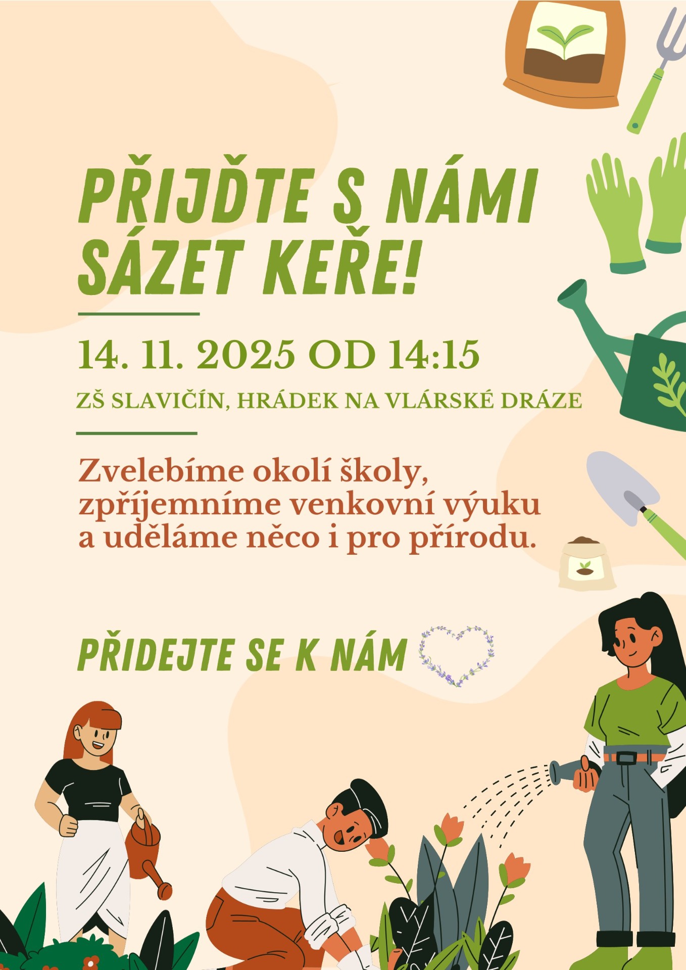 Milí rodiče a přátelé školy, zveme vás na dobrovolnickou akci sázení keřů, která se uskuteční tento pátek 14. listopadu od 14:15 na pozemku naší školy. Cílem je společně zvelebit školní areál, vytvořit příjemnější prostředí pro výuku i odpočinek a zároveň udělat něco dobrého pro přírodu. Každá ruka se počítá – budeme moc rádi, pokud se přidáte! Těšíme se na vás!
